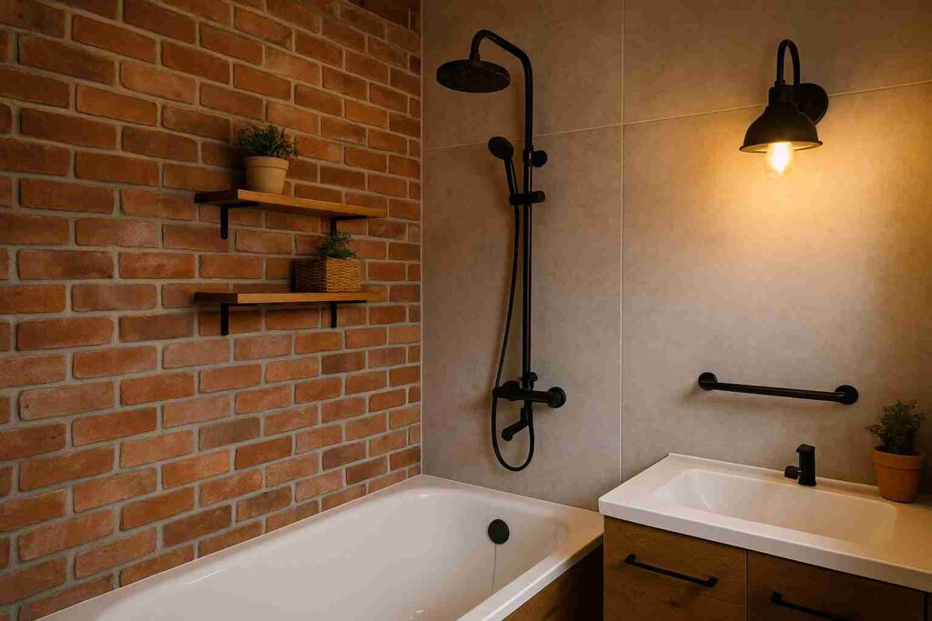既製のユニットバスでも、アクセント壁を一面だけレンガ調に変えるだけで印象が一変します。