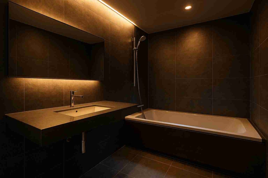 - 配色:ダークグレー×石目調、間接照明、ワイドミラー。