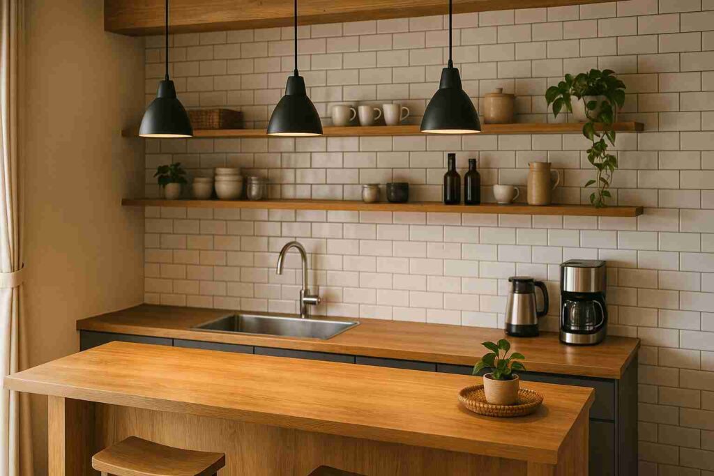 木目扉や白いタイル壁を組み合わせると、温もりある空間になります。