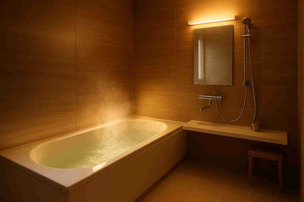 間接照明やワイドミラーを組み合わせることで、夜のバスタイムが非日常空間に変わります。