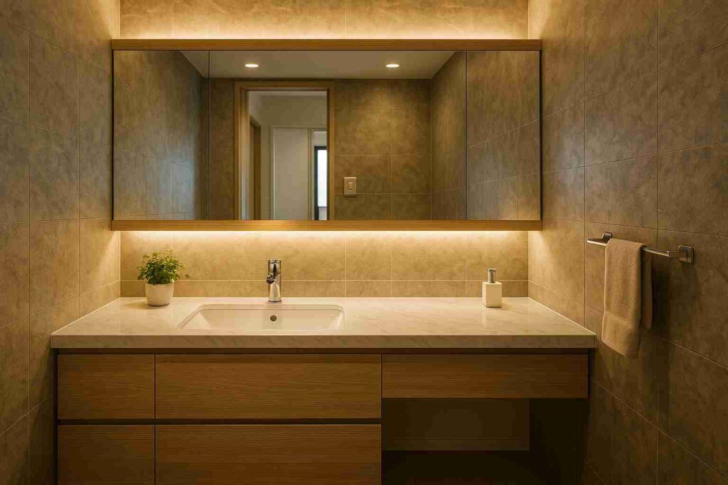 LEDバックライトミラーや調光機能付き照明も増えており、機能性と高級感を両立できます。