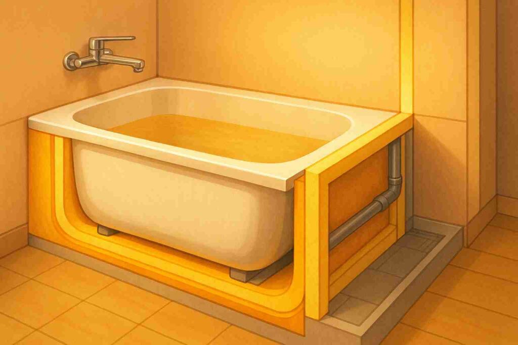- 浴槽を据え付け、給排水を接続